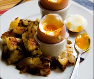 Place the two eggs into a small pot and cover with water and bring to the boil. When the water begins to boil, set a timer for 3 minutes. After 3 minutes drain the eggs under cold water and serve alongside a generous portion of home fries. |