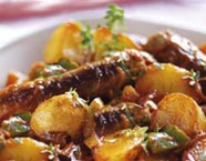 1 Heat the oil in a large frying pan and fry the potatoes and sausages for 5 minutes. Add the onion and pepper and cook for a further 5 minutes, turning the sausages occasionally until browned.
