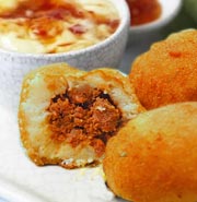 4. Spread a spoonful of the potato dough mix in the palm of your hand. Make an indentation in the middle and stuff it with the meat mixture.